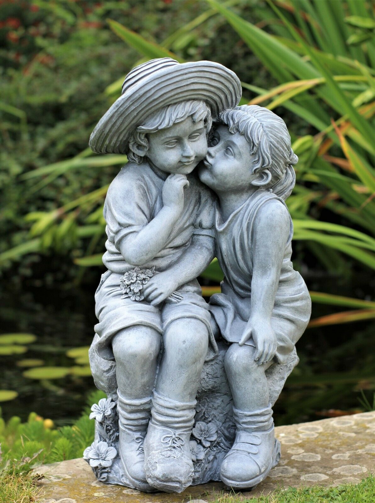 Add a touch of nostalgia to your outdoor decor with our resin sculptures of a little boy and girl sharing their first kiss.