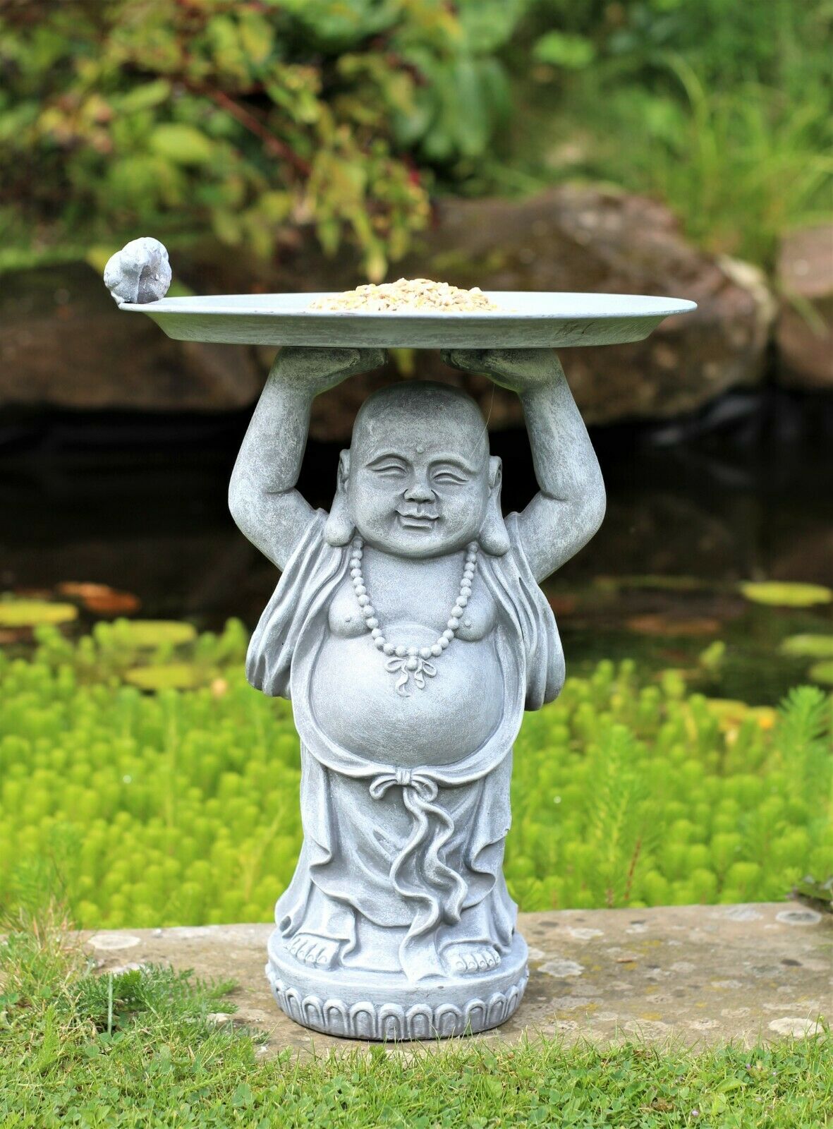 Standing Buddha Statue & Garden Ornament with Bird Feeder