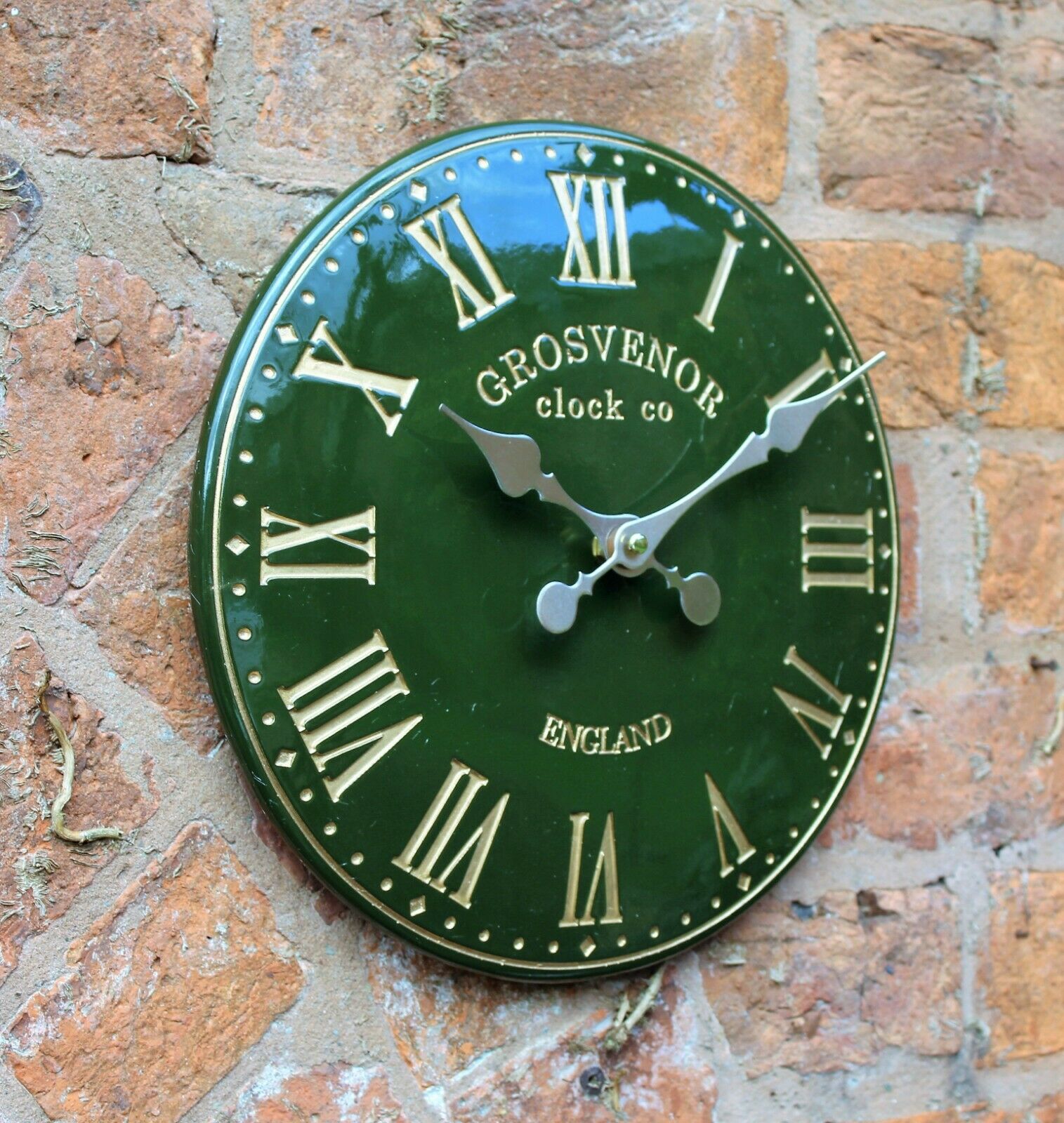 Our green and gold detailed outdoor wall clock is a lovely addition to any garden. Prepare your outer home for summer, making it the perfect garden experience. This stylish 12 inch roman numeral display is great for indoor or outdoor use as it is weather resistant tested. With a dark face and bold golden roman numerals this piece will stand out and add a vintage atmosphere to any room inside or out. This clock would also make a fabulous house warming gift for a loved one, why not share your discovery!