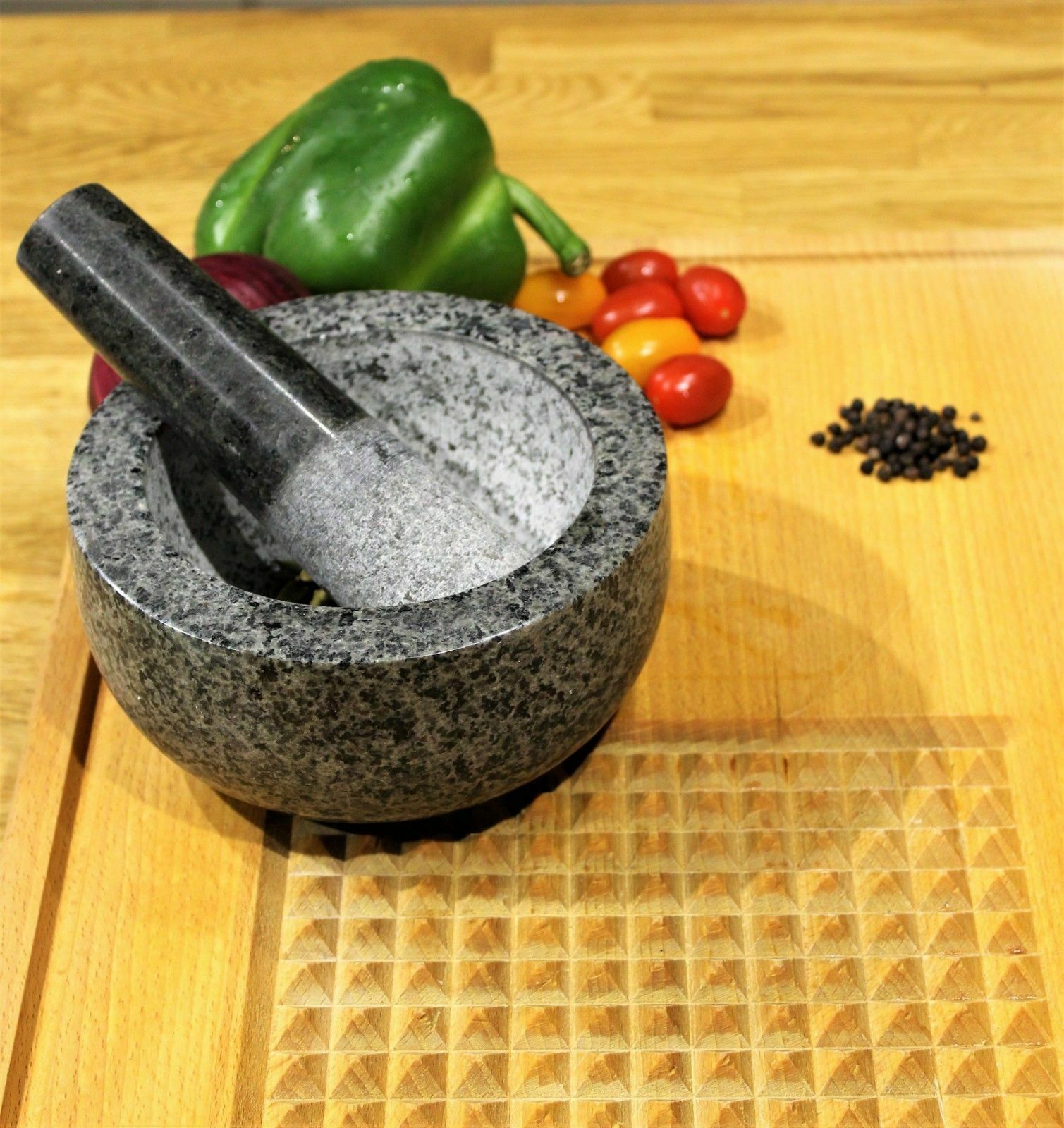 Grind, crush, pound spices and herbs with the solid granite pestle and mortar set. This would be perfect to help you make pastes and pesto from all your fresh ingredients. Ideal gift for any cook and is an essential tool in the kitchen. This pestle and mortar set is made from premium quality granite stone and will look great in any kitchen.
